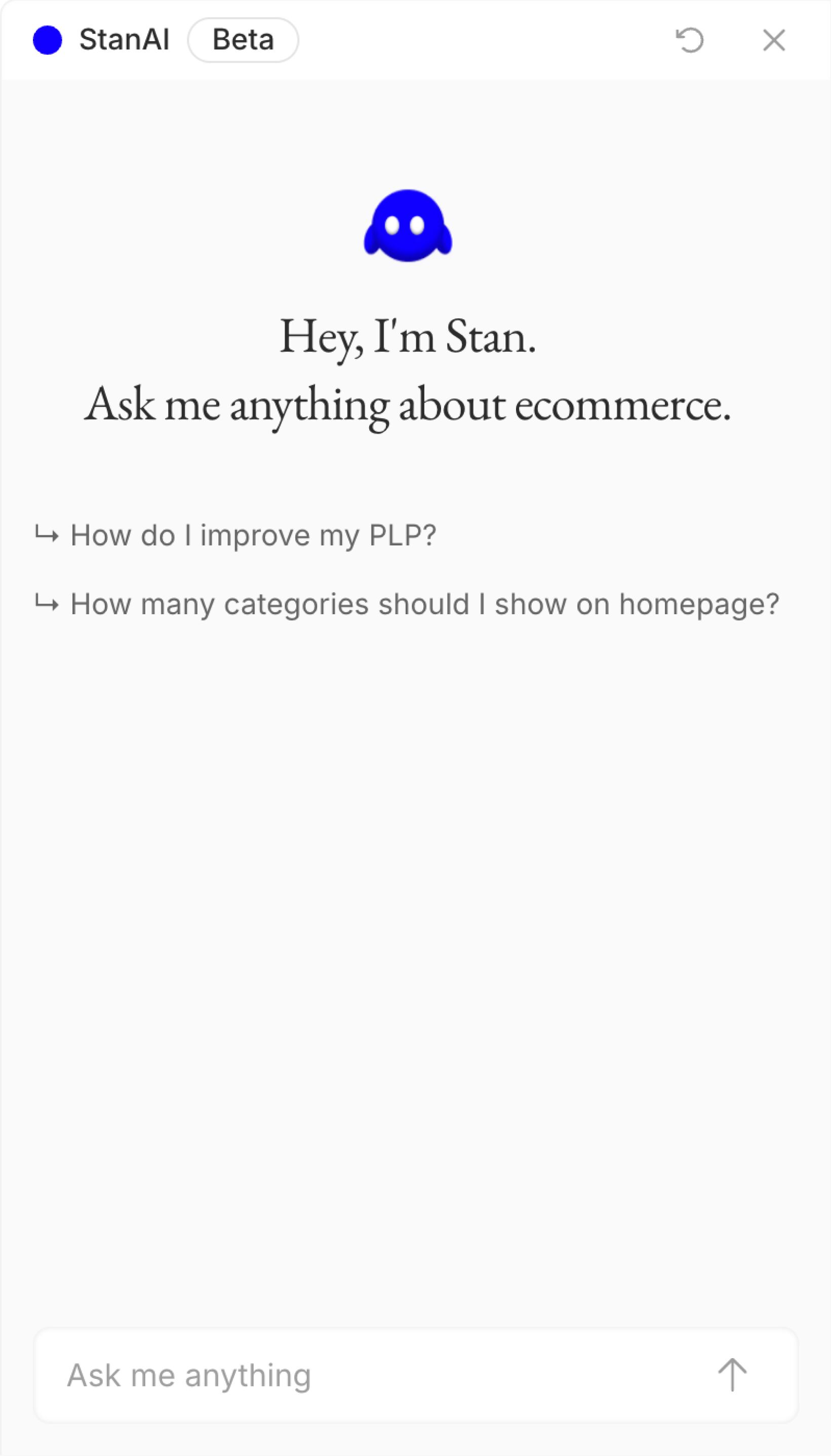 Merchants need answers in context, so I trained an AI assistant I named Stan on ecommerce research so merchants can get specific guidance on everything from checkout flows to product page layout without leaving the platform.